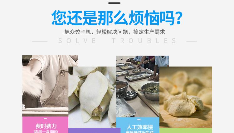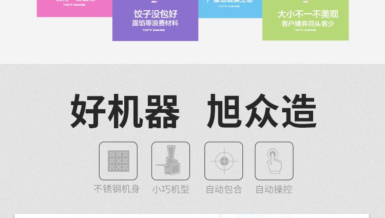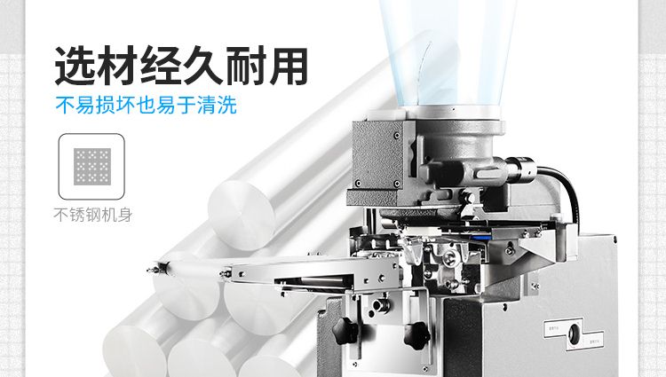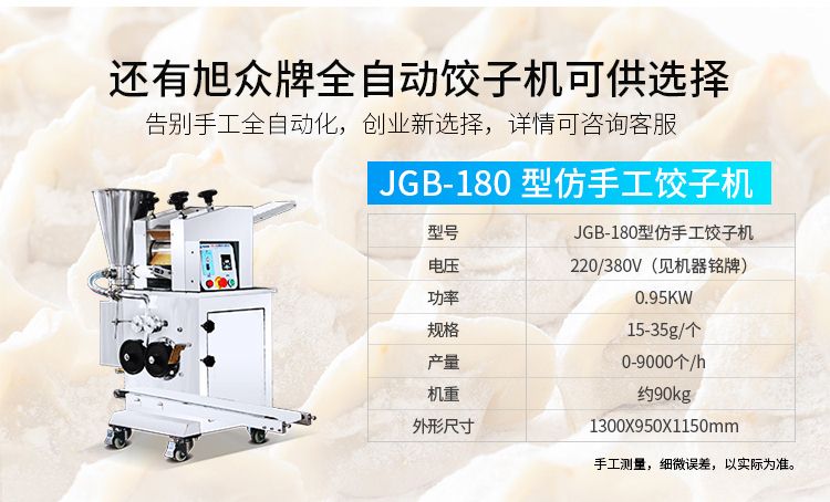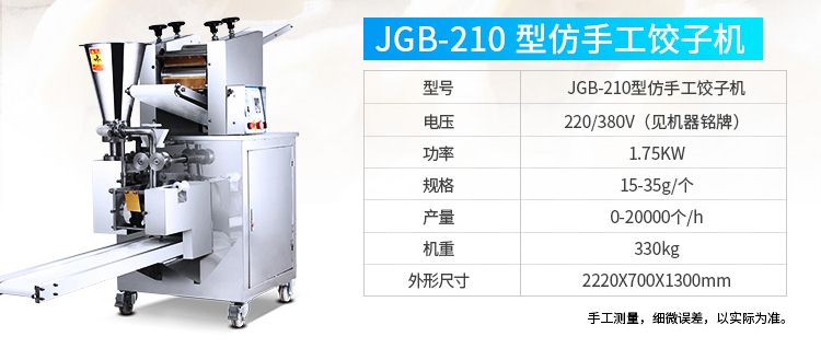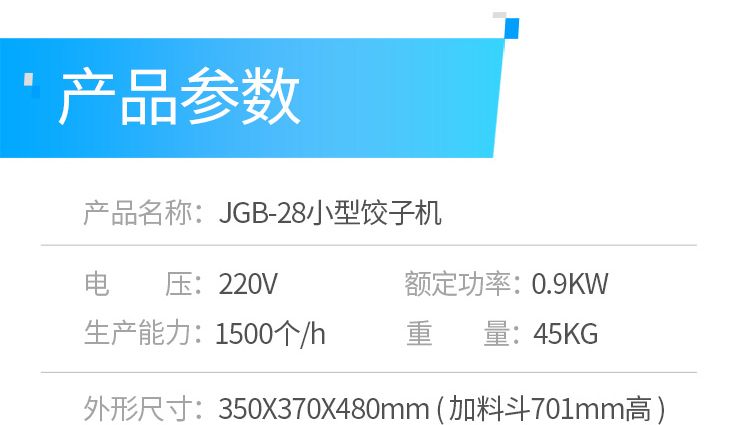 JGB-28型小型餃子機可包蒸餃、煎餃、水餃。仿手工包合,保持了餡和皮的原汁原味。可包米面皮、薯條粉皮等特殊材質餃子。任何葷、素餡料都可包制。外觀小巧、精致,操作簡單。本機提供免費上門培訓指導、安裝、調試、面點工藝傳授。